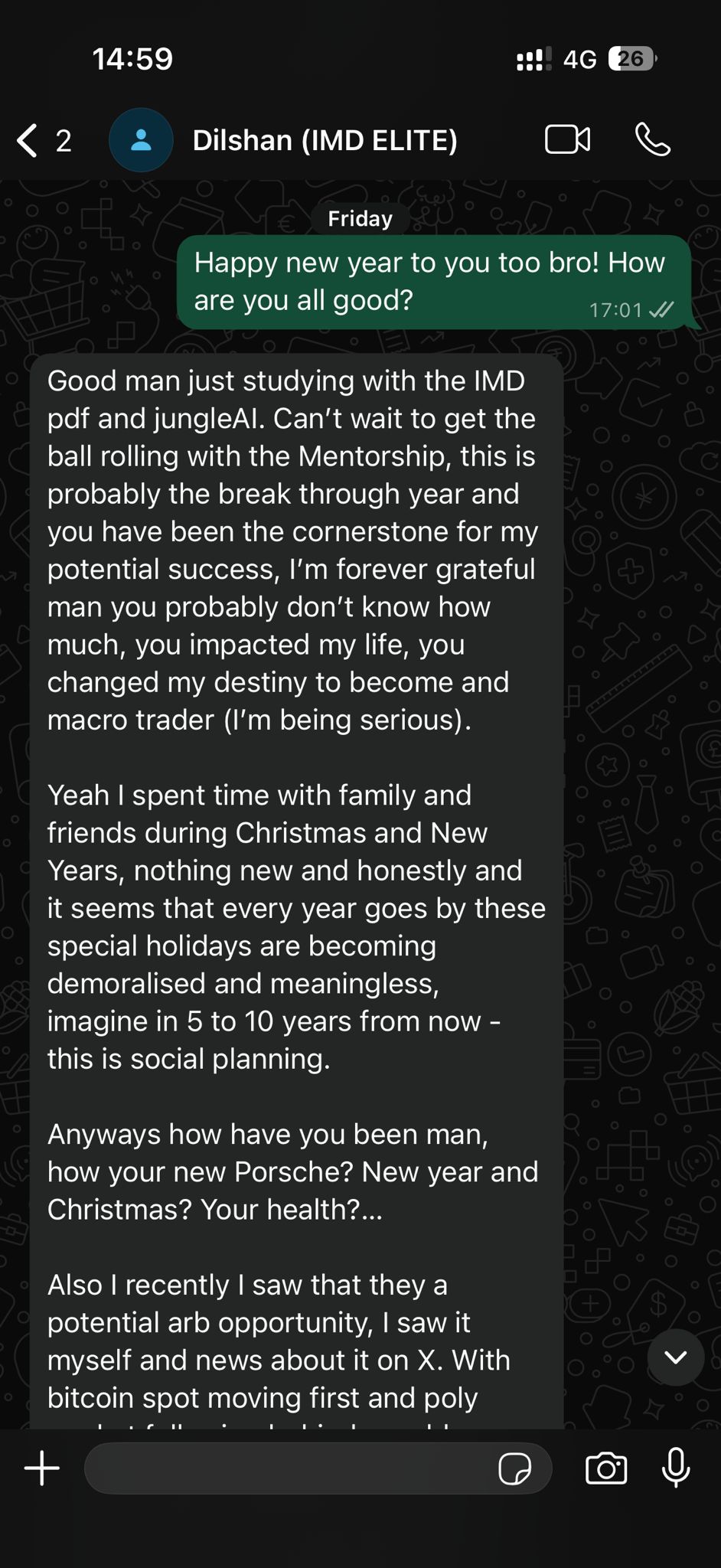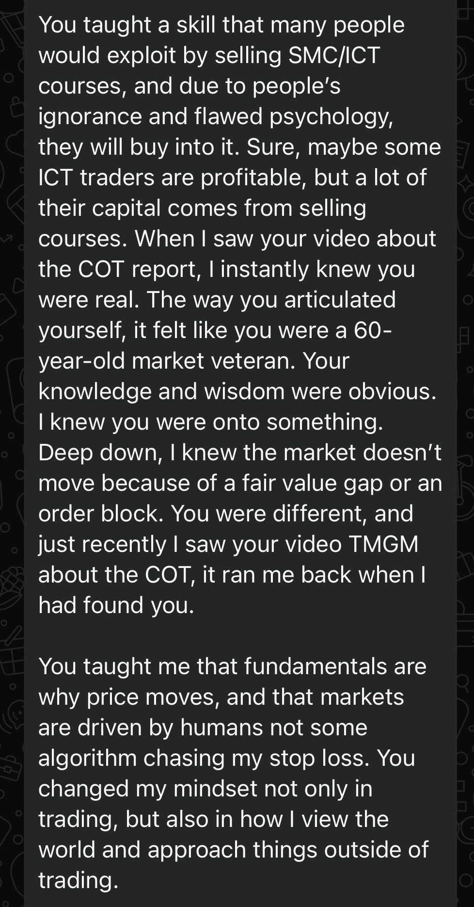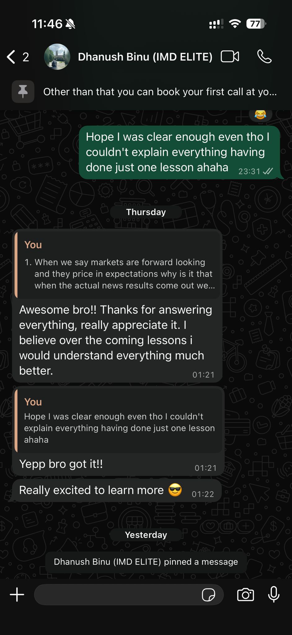 Joined IMD with a finance background but no real understanding of why markets move. After 8 lessons, went from blindly reading charts to thinking like a macro trader. Describes the PDFs and research tools as clearer than anything he had seen before. Currently on demo account, planning to scale with prop firms, and already mapping out his full trading roadmap.
