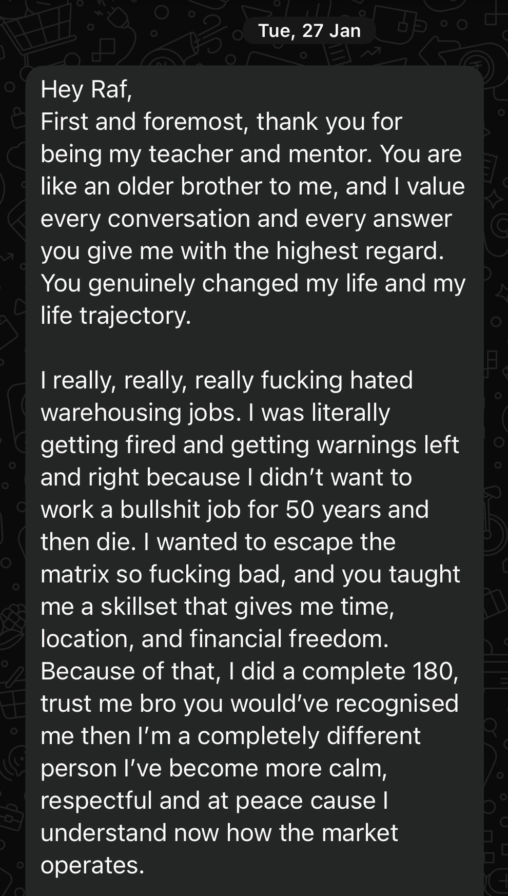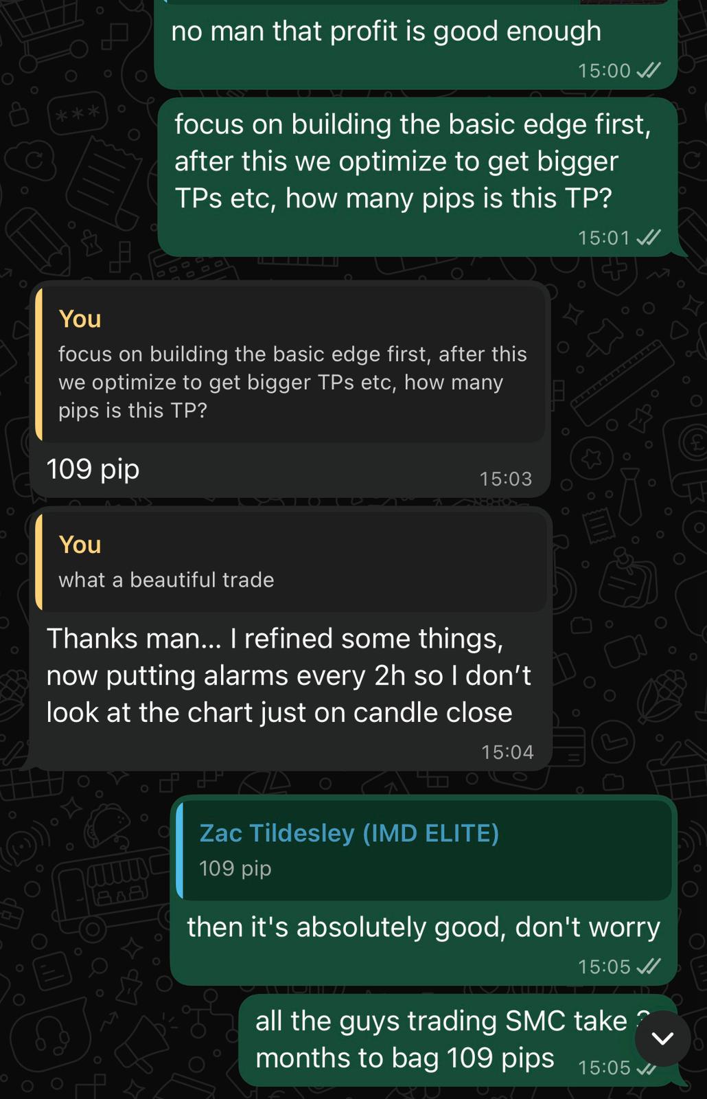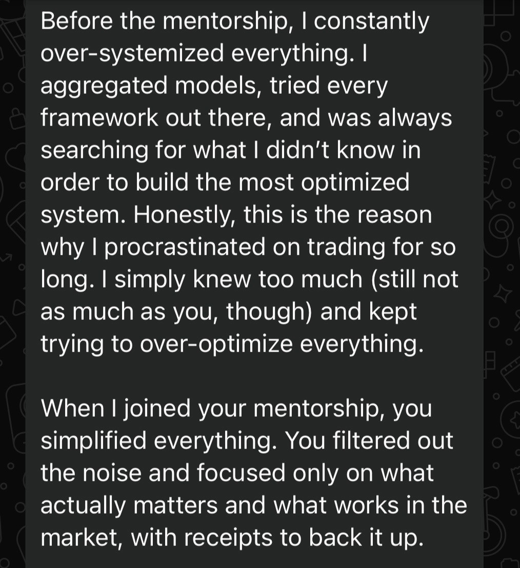 Stuck in break even for 3-4 years despite studying everything online. Joined IMD 5 months ago. Got his first take profit in week one. Now trading profitably, living in Dubai, and working directly alongside Raph as part of the program's selection team.